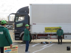 左折巻込み実演、内輪差説明、