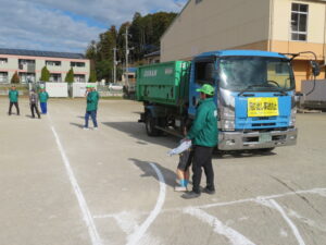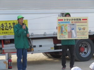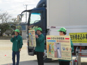 児童たちもトラックの大きな車体を目の当たりにし、左折巻込み事故や飛出し事故の実演でダミー人形が轢かれてしまった際には大きな声を出して驚いていたり、部会員からの「どうすれば今の事故が防げたか」との質問に対しても、積極的に手を挙げて発言していた光景がとても印象的でした。