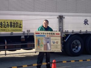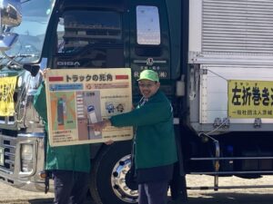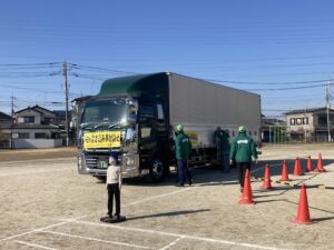 取手市立藤代小学校の5・6年生を対象に事故防止教室を午前中に実施しました。当日は冬とは思えないほど穏やかな暖かさで、活動を行うのに適した気候でした。会場には普段見慣れない大きなトラックも配置され、児童たちは興味津々で、実物を前にした際には興奮した様子も見られました。講話や体験活動を通して、日常生活や登下校に潜む危険について理解を深める貴重な機会となりました。