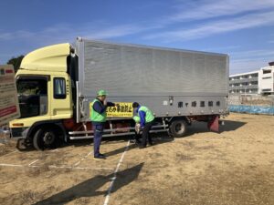 教室では、トラックの内輪差について実際の車両を用いて学び、児童は大きな車体が曲がる際に生じる危険を目の当たりにしました。